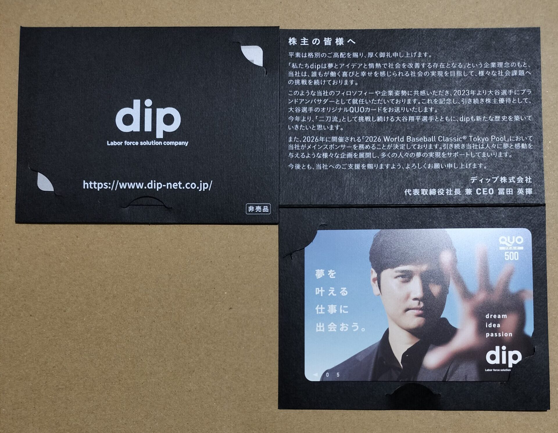 2379 ディップから届いた株主優待です。100株保有でQUOカード 500円です。今回もブランドアンバサダーの大…
