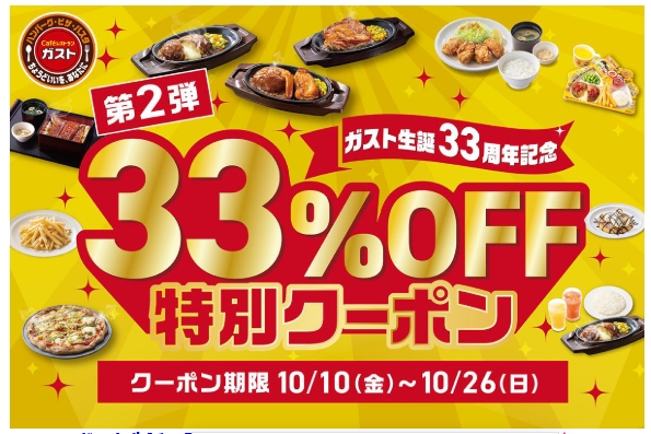 ガスト生誕33周年記念でお得なクーポンが多数あったので