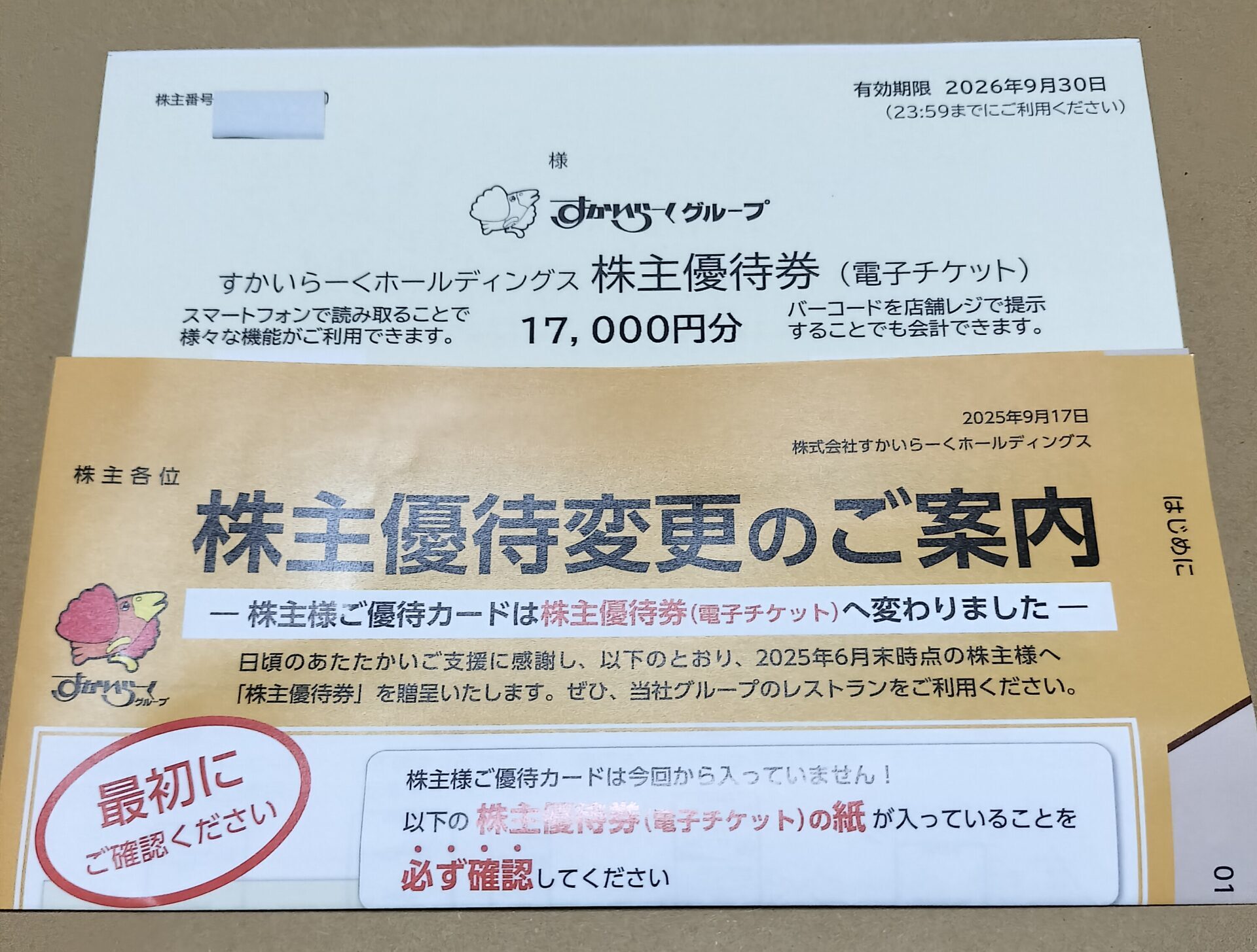 3197 すかいらーくホールディングスから届いた株主優待です。今回から1000株保有で17000円分の電子チケッ…