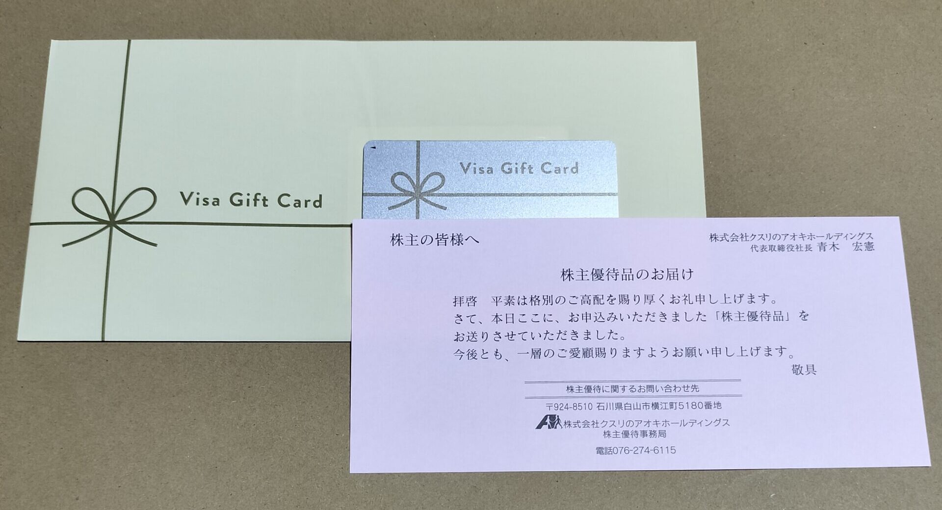 3549 クスリのアオキホールディングスから届いた株主優待です。100株保有でVisa ギフトカード 1500円分に…