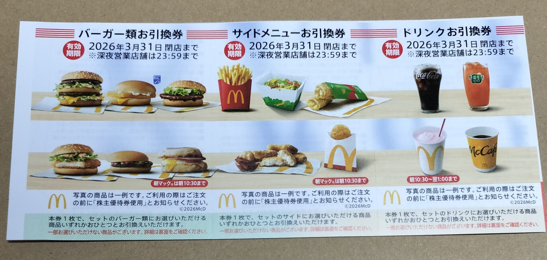 2702 日本マクドナルドホールディングスから株主優待が届きました。100株保有でバーガー類、サイドメニュ…