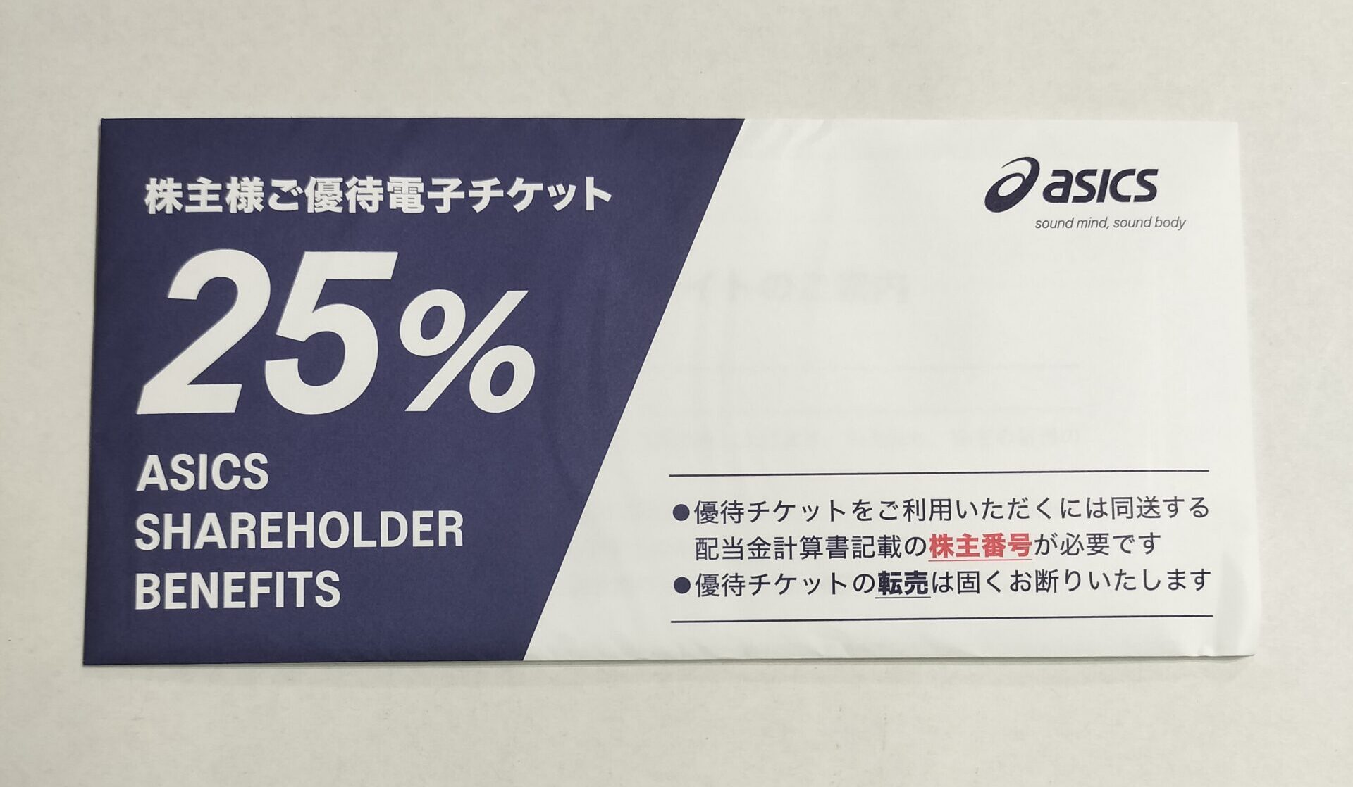 7936アシックスより株主優待が届きました。100株で25%割引券各10枚です。人気の株主優待です…